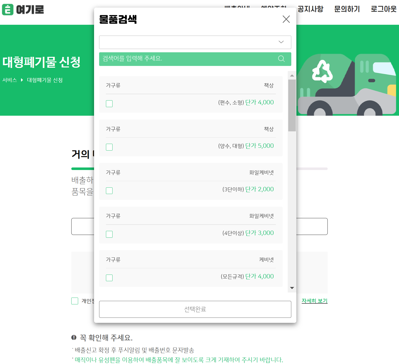 - 지정한 수거 장소에 품목이 확인되지 않을 경우, 수거되지 않습니다.