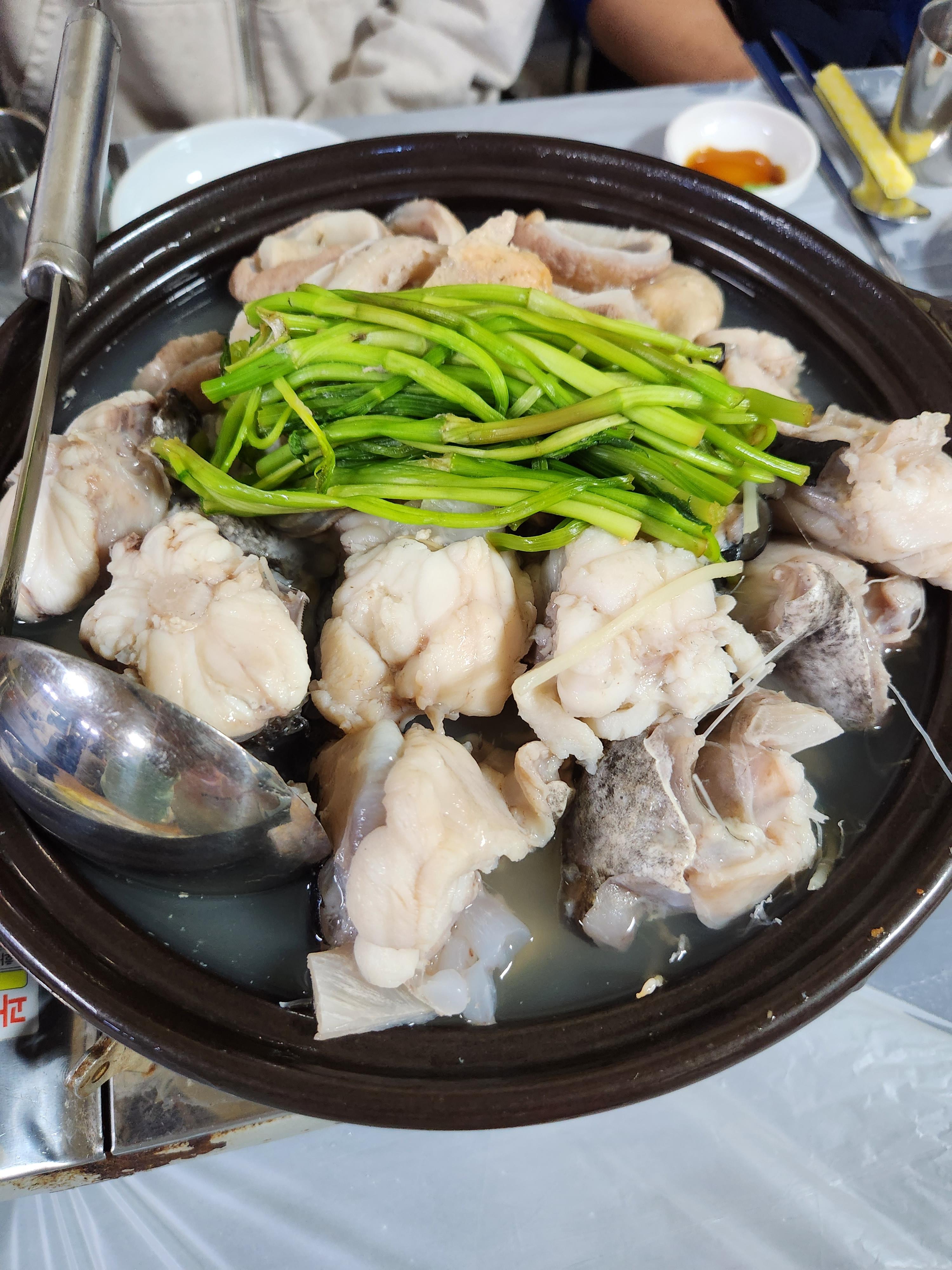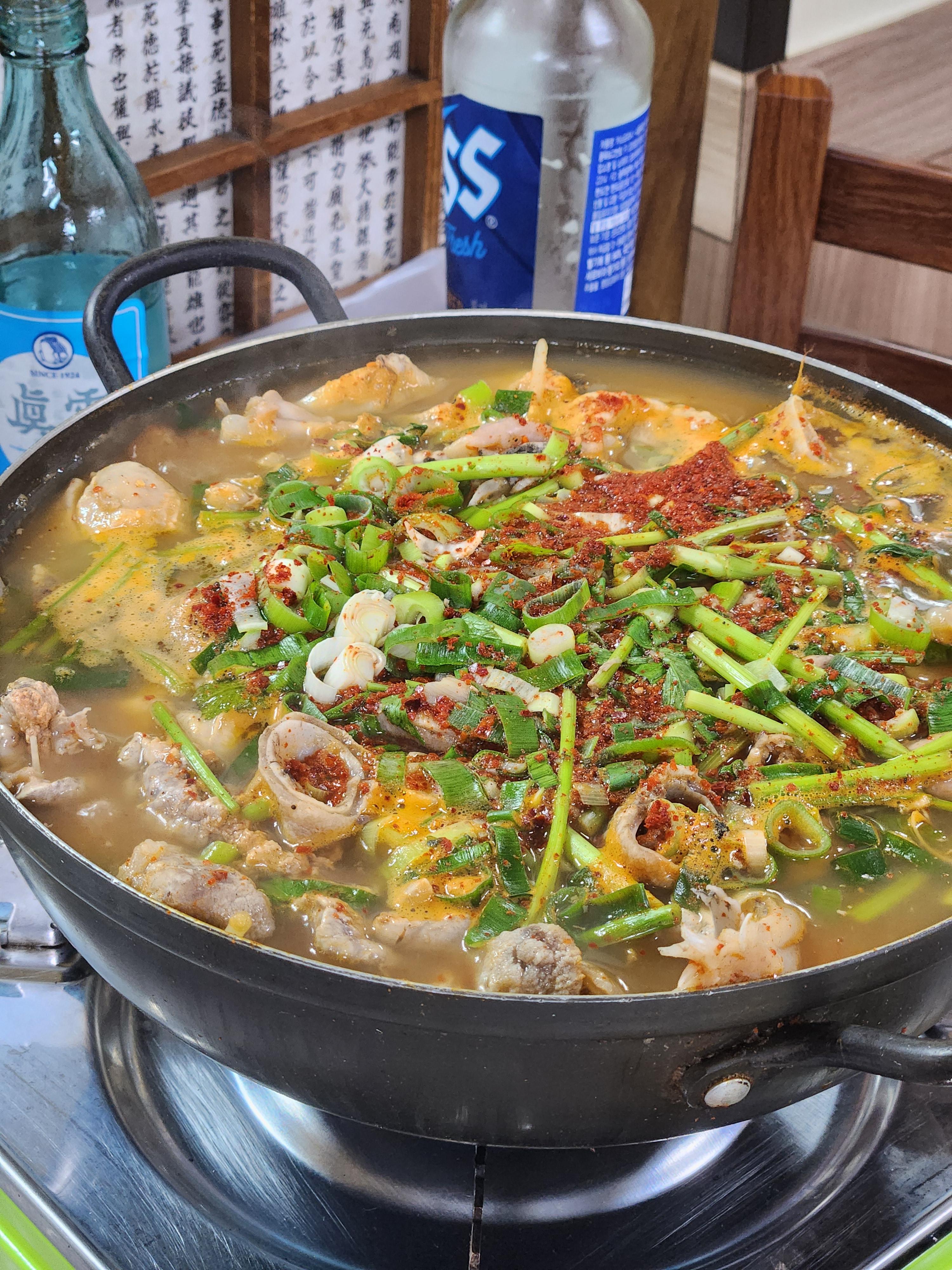 🍲 아구내장탕 - 신선한 아구살과 내장, 애(간)가 듬뿍 들어가서 국물이 시원하면서도 녹진한 맛을 자랑해요. 해물탕 같은 칼칼함이 느껴지면서도 비린 맛 없이 깔끔한 국물이라 남녀노소 부담 없이 즐길 수 있어요. 현지인들이 많이 찾는 이유를 알겠더라고요. 내장탕 못 먹는 사람도 먹을 수 있어요! 😆